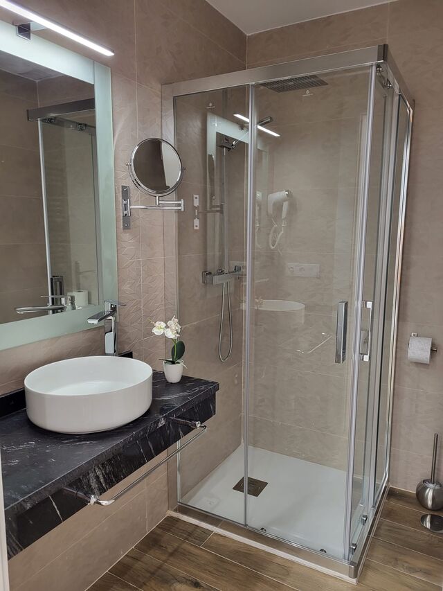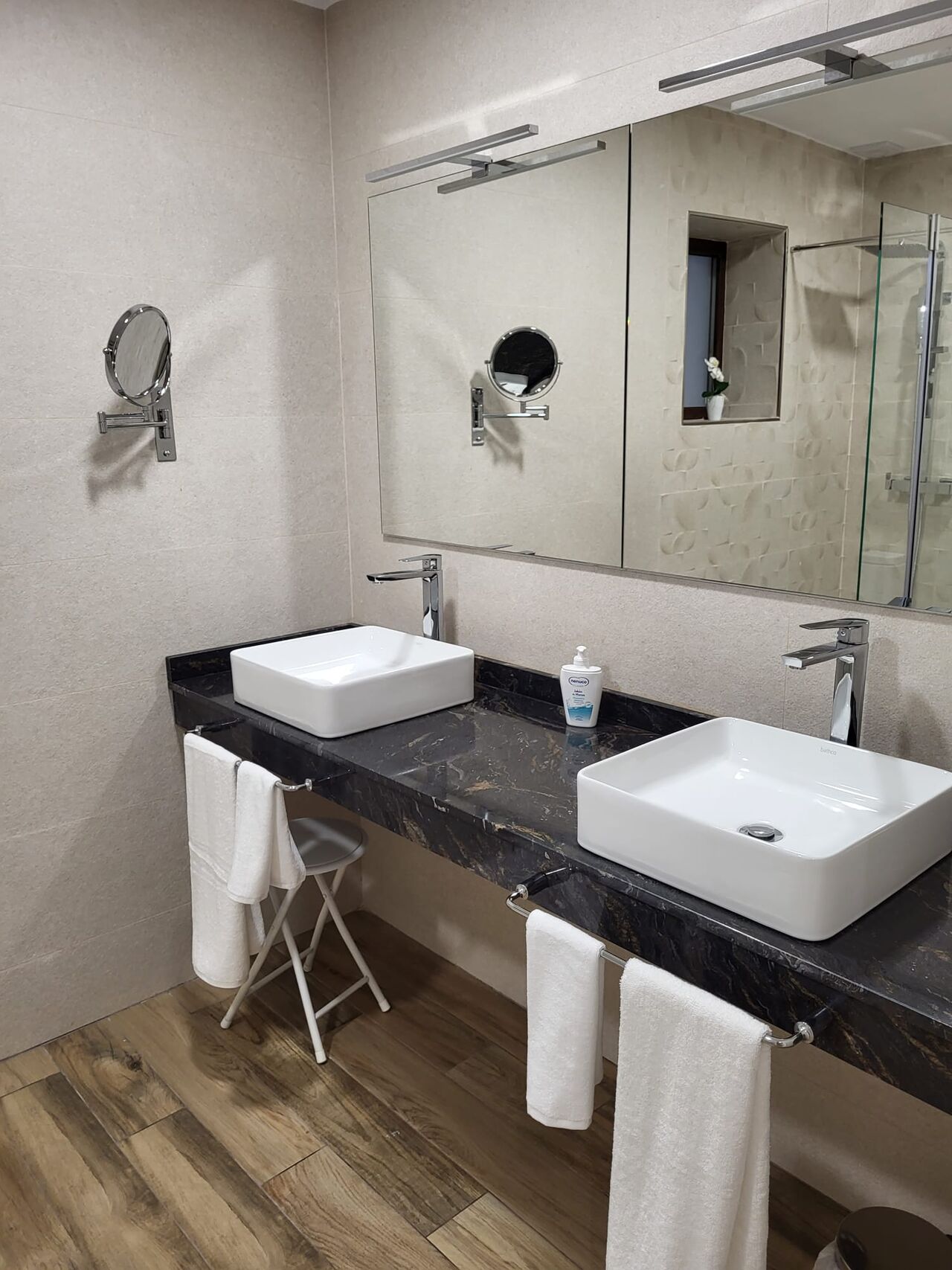 Baño con dos lavabo plato ducha adaptado para minusvalidos, con secatoalla ,secador y espejo de aumento
